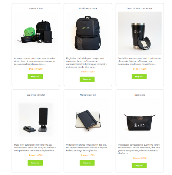 Na lojinha do Viva Educa o visitante encontra diversos produtos exclusivos da Viva para resgatar com os pontos acumulados na plataforma. Todo o consumo de conteúdo soma pontos. Quanto maior a interação no site, mais pontos são acumulados para trocar por recompensas selecionadas.